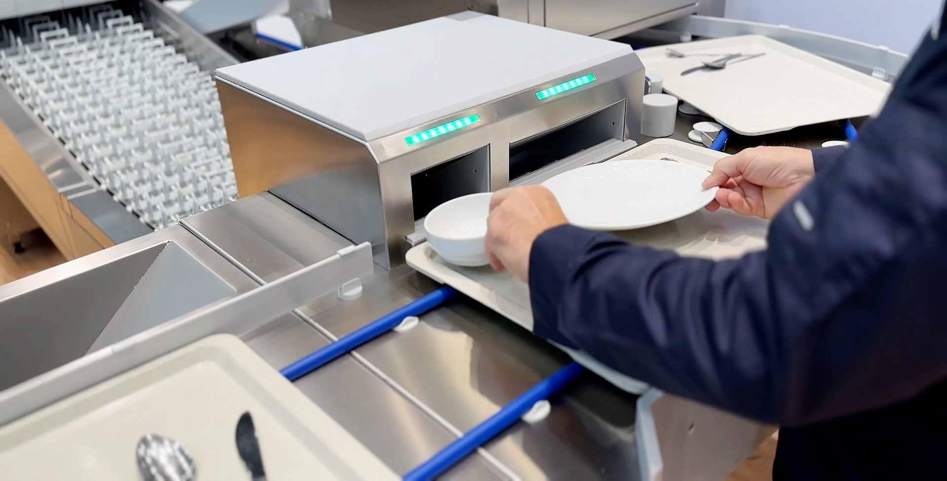 Gracias a la función SMART VISION CONTROL basada en IA, el lavavajillas de cinta transportadora FLOW Line detecta cuándo un objeto se coloca en la cinta transportadora. La máquina ajusta automáticamente la velocidad de la cinta transportadora, la presión de lavado y la cantidad de agua que se aplica al objeto. Esto garantiza unos excelentes resultados de lavado con poco consumo de agua, sin importar quién maneja la máquina.