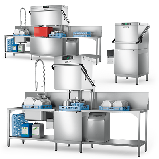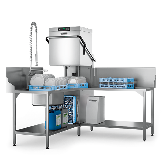 Los lavavajillas de capota HOBART se pueden instalar en cualquier lugar de la cocina y se adaptan al flujo de trabajo. Además de instalarse a lo largo de una pared entre las mesas de carga y descarga, todos los lavavajillas de capota se pueden integrar en un sistema de mesas como instalaciones en esquina.