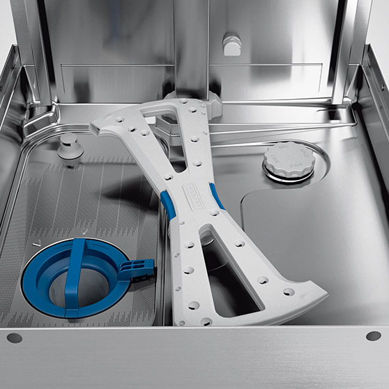 Gracias a su gran rendimiento de lavado, los brazos de lavado cruzados HOBART de 4 radios son una opción excelente. Los brazos de lavado hacen que el contacto del agua con el menaje dure dos veces más y los orificios con ángulo de rociado distribuyen el agua de forma óptima.
