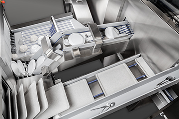 Como en los sistemas semiautomáticos, las bandejas se apilan automáticamente encima de un carro de apilado de bandejas y la cubertería se lanza a través de una rampa para depositarla en la cesta de cubiertos situada debajo. Adicionalmente, una unidad de desapilado de platos automática introduce los platos en un sistema automático. Si es necesario, los cubiertos se pueden introducir en un sistema de clasificación automática de cubiertos.